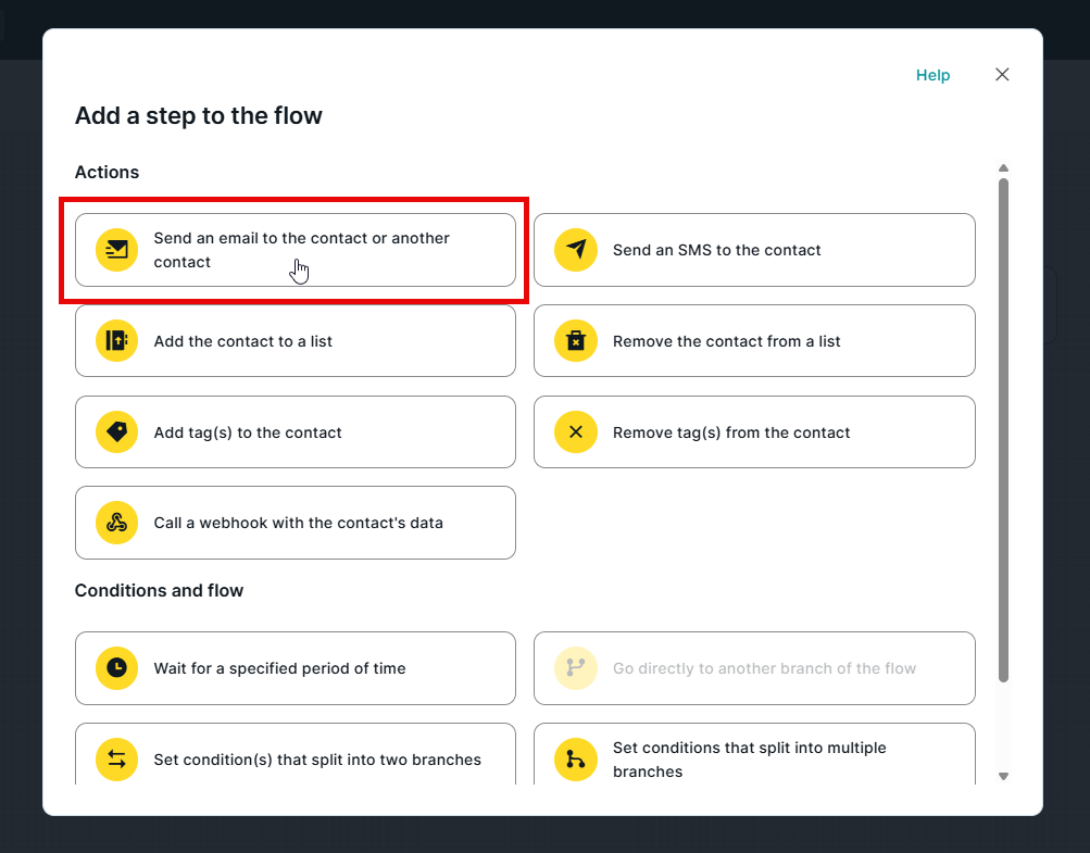 To add the step to the flow, click the '+' button and select the 'send an email to the contact or to another contact' option from the actions category.