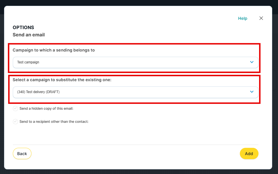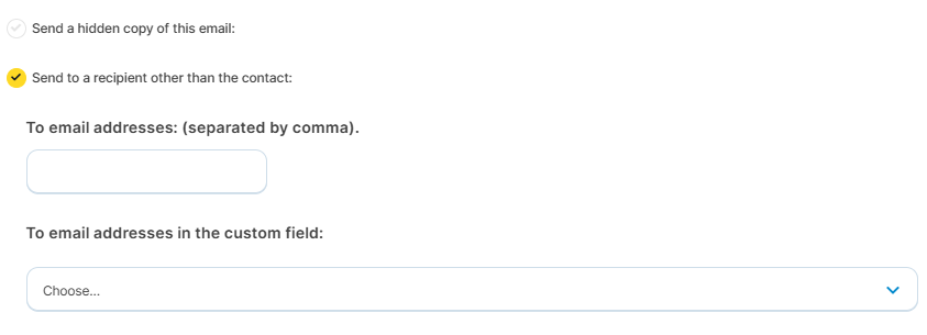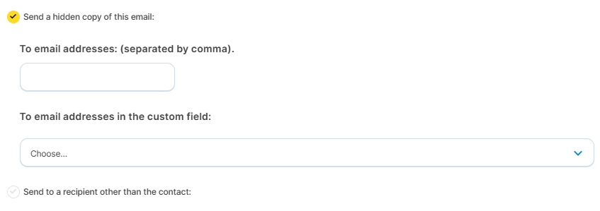 'Send a hidden copy of this email': if you check this option, a blind copy (BCC) of the email will be sent to the address you specify, in addition to being sent to the contact.