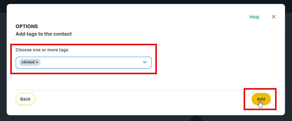 In the next window, you will be asked to select one or more tags from those already created in the account. You can also create new tags by typing them directly and separating them with a comma. Once this is done, simply click the yellow 'Add' button.