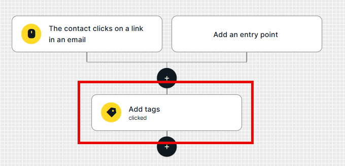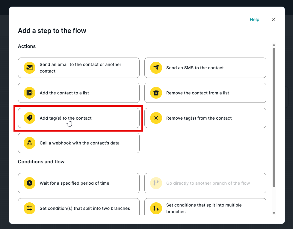 If you want to add a step that assigns tag(s) to contacts reaching a specific node—after having gone through previous ones—the first thing you need to do is click the “+” button and select the 'Add tag(s) to contact' option under the 'Actions' category.