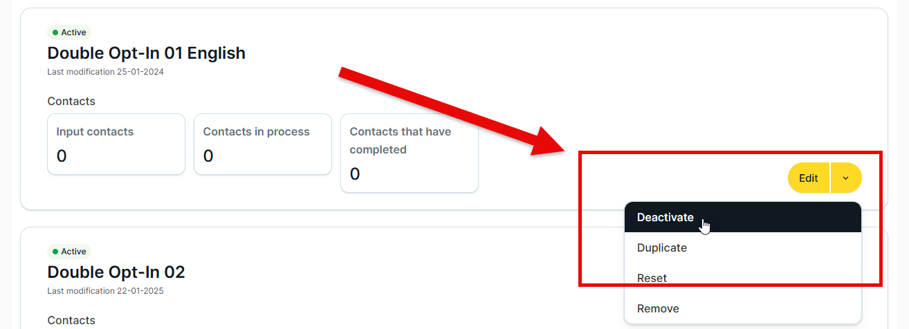 Locate the card of the flow you want to deactivate, click on the action arrow next to the "Edit" button, and select "Deactivate."