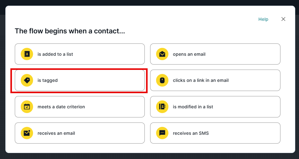 If we want the event that triggers a Marketing Automation flow to be the assignment of a tag to a contact, we must select the entry point "is tagged"