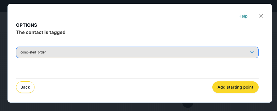 A window will open with a selector displaying all the tags created in the subaccount. We select the tag we want to use as the trigger for the contact to enter the flow.