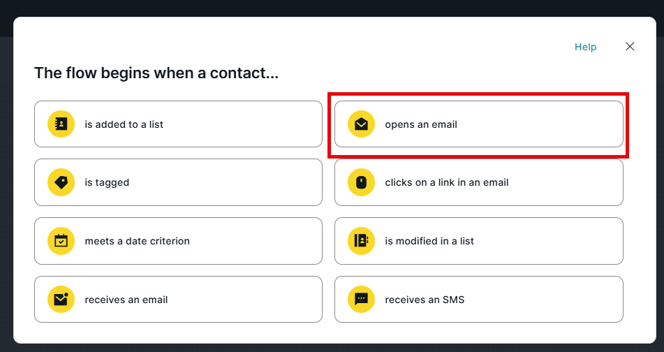 If we want the event that triggers a Marketing Automation flow in MDirector to be a contact opening or reading an email, we must select the entry point "opens an email".