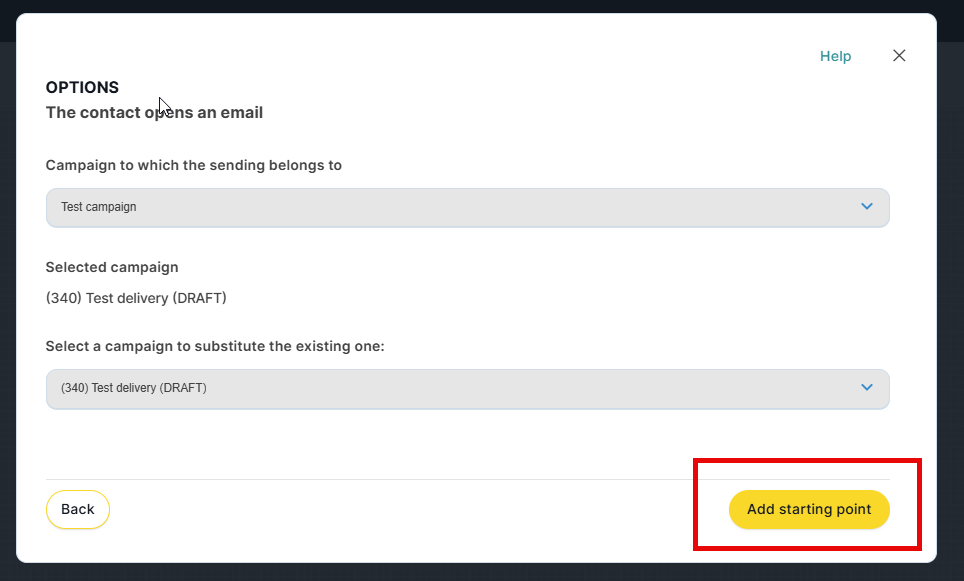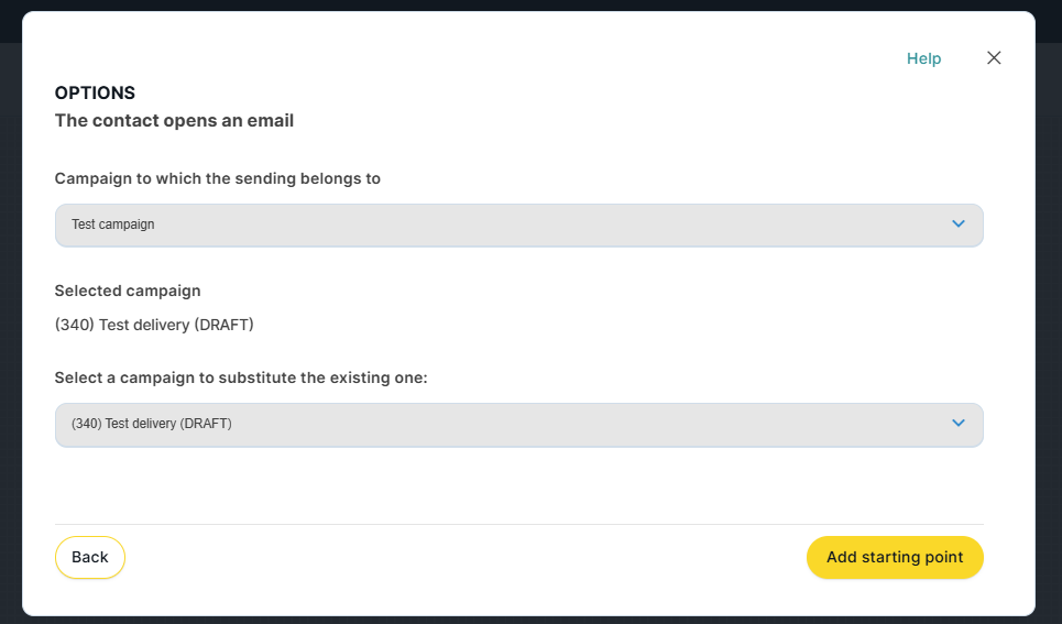 When using this entry point, you’ll need to select both the campaign and the specific send. If you want the opening of several sends to be able to trigger the flow, you’ll need to add an entry point for each one.