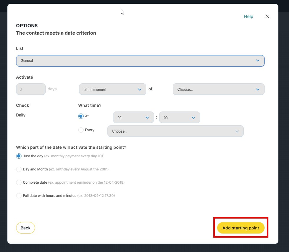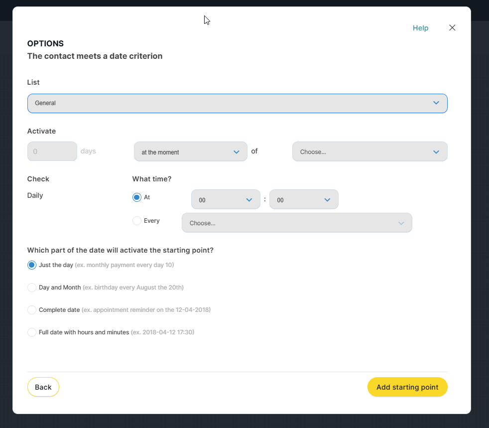 - Which part of the date will trigger this entry point: day only, day and month, full date, or full date with time (hours and minutes)