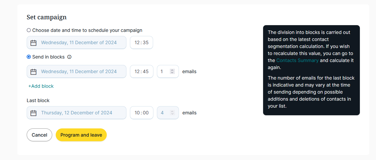 Add the blocks you need by indicating date, time and volume. Remember when scheduling you campaign in blocks, they need to be sorted chronologically. For example: