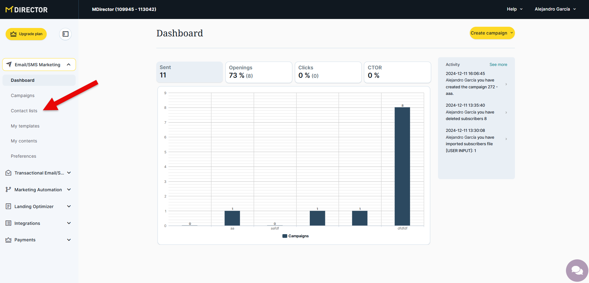 1. Go to the "Contact lists" option in the dropdown menu of the Email/SMS Marketing service located on the left-hand side of the screen
