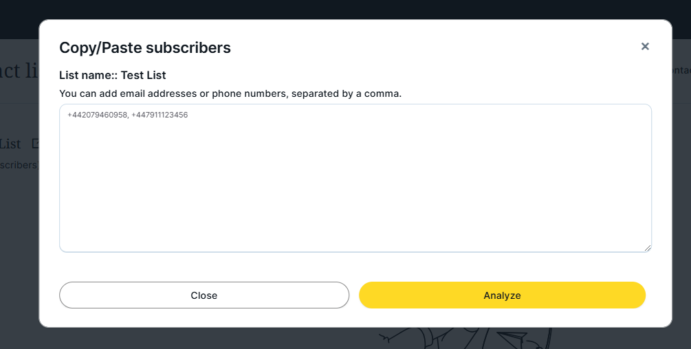 3. A window will open, where we can copy and paste the email addresses or phone numbers. It is important to separate them with commas and not mix numbers with emails. Once copied, click the yellow "Analyze" button