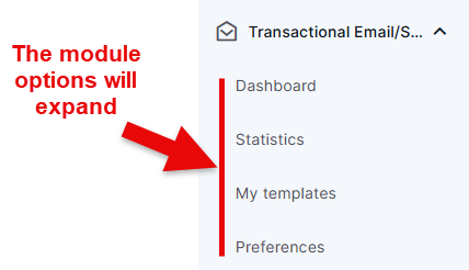 To access it, go to the side menu located on the left side of your screen, making sure it is expanded, and click on the title or the arrow to its right, which will display the sections of the module: Dashboard, Statistics, My Templates, and Preferences. To enter the module, you need to navigate to one of these sections by clicking on the name of the one you want to access.