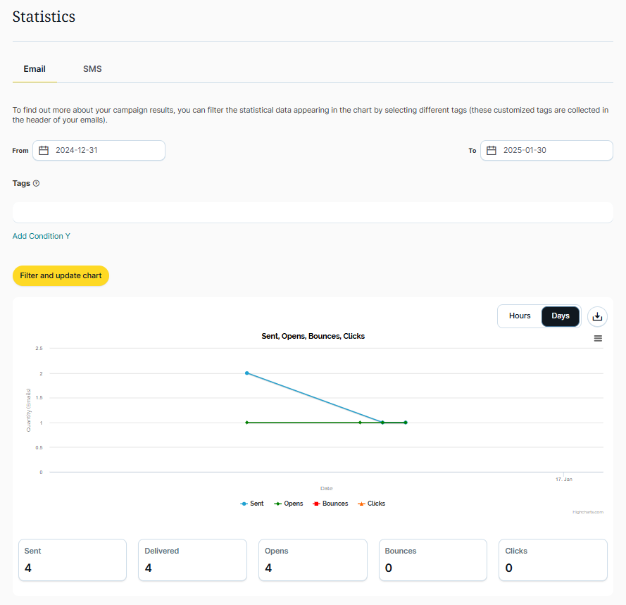 From this section, we can review the results of the invíos and filter the data by a date range, by selecting tags, and breaking it down by emails or SMS.