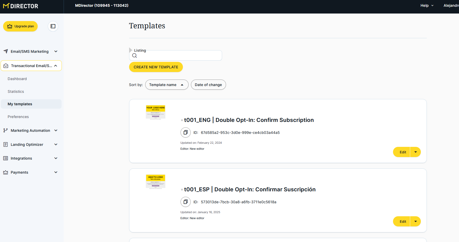 From this section, we can design the creatives that we will use specifically for this service. Here, we land on the list, where we can access the editing of any of the ones we have already created or create a new one from the "Create new template" button.