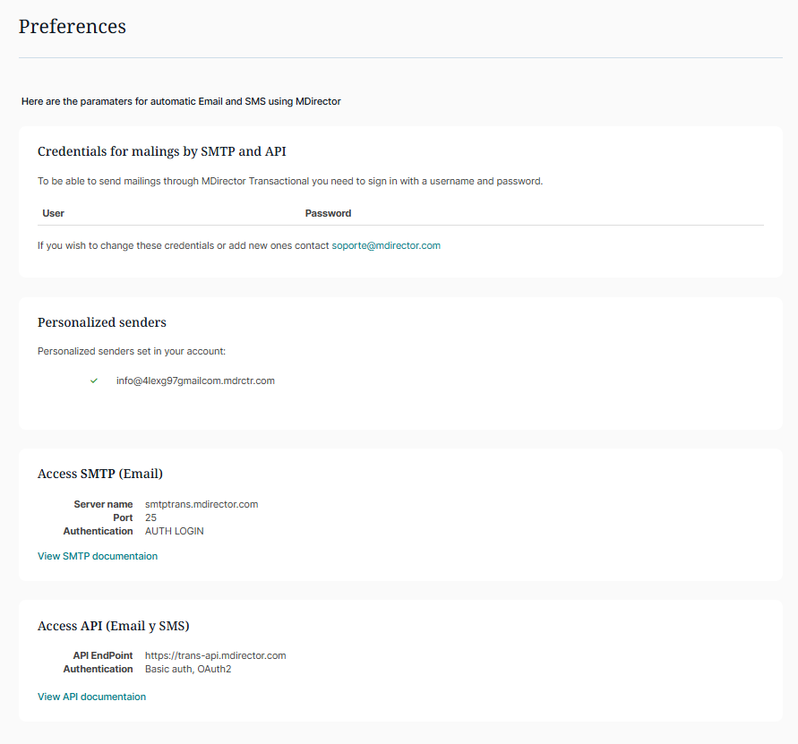 From this section, we can check the credentials for sends via SMTP and API, as well as the custom senders.