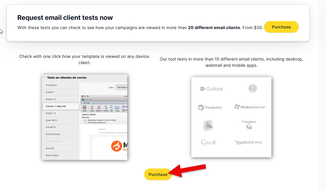 Email client tests are initially available only for the MD Total plan. However, if you have any other plan, you can purchase them as an additional feature for your account. To do this, go to step 4 of the email send-out creation process, where they would normally appear, and instead, you will find a button to purchase them. Click on it, and our team will contact you to inform you of the cost and process the activation as soon as possible.