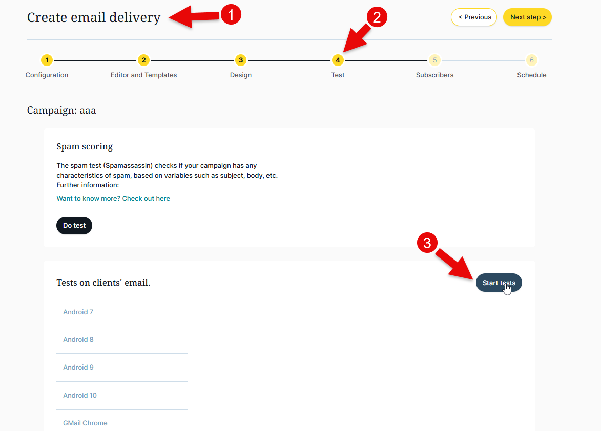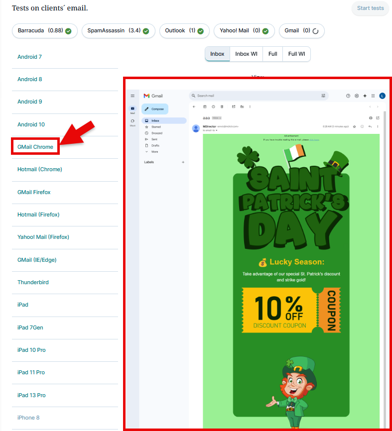 To use email client tests in MDirector, go to step 4 (Test) when creating an email send-out. There, you will find them under "Tests in email clients." To generate previews, first, click the "Start Tests" button. After a few seconds, once they have loaded, you can click on any of the titles in the Devices, Clients, and Browsers column to view them.