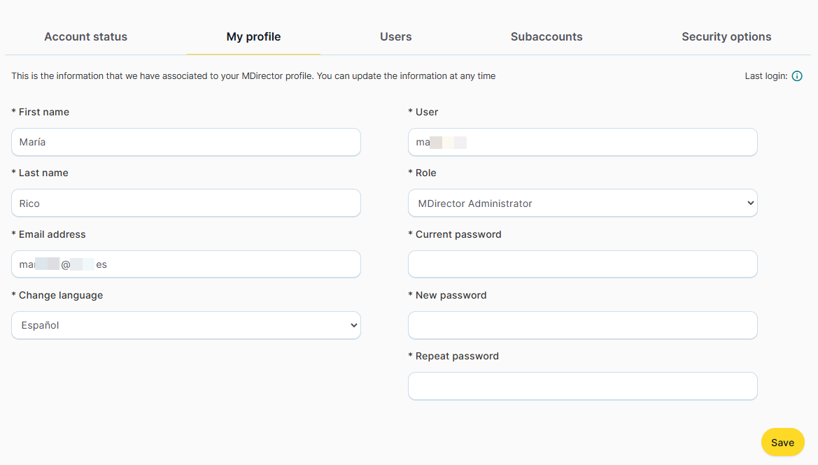 To modify the access credentials to the MDirector account, the following steps must be followed: