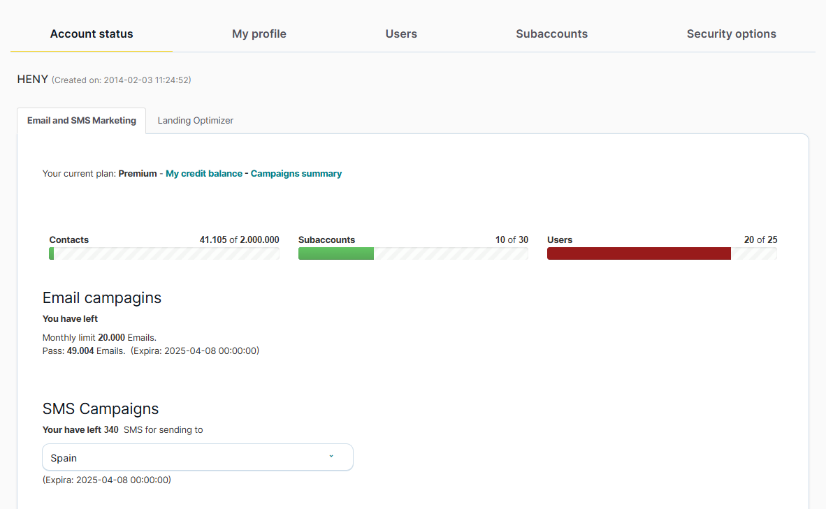 Other information that you can check, by clicking on the drop-down at the top right, you can click on My MDirector Account and see tab Account Status. Here you will see the volumens you have available currently for your campaigns.