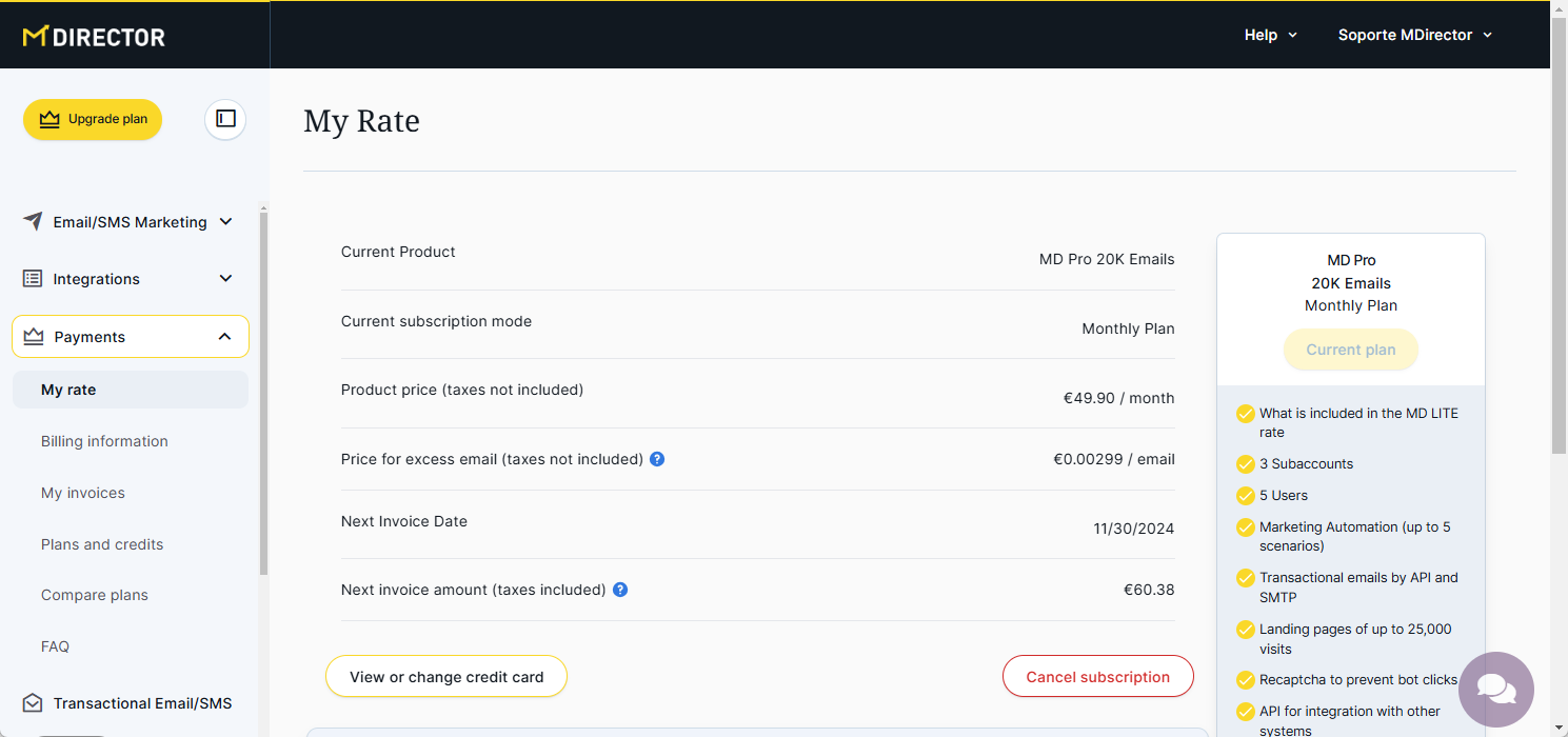 - When you log into your MDirector account, on the left menu, click on "Payments" section and then on "My rate" subsection. You will see a link to "My Rate". From here you will be able to see the plan you have currently contracted, view or modify your credit card for payments, or cancel your subscription.