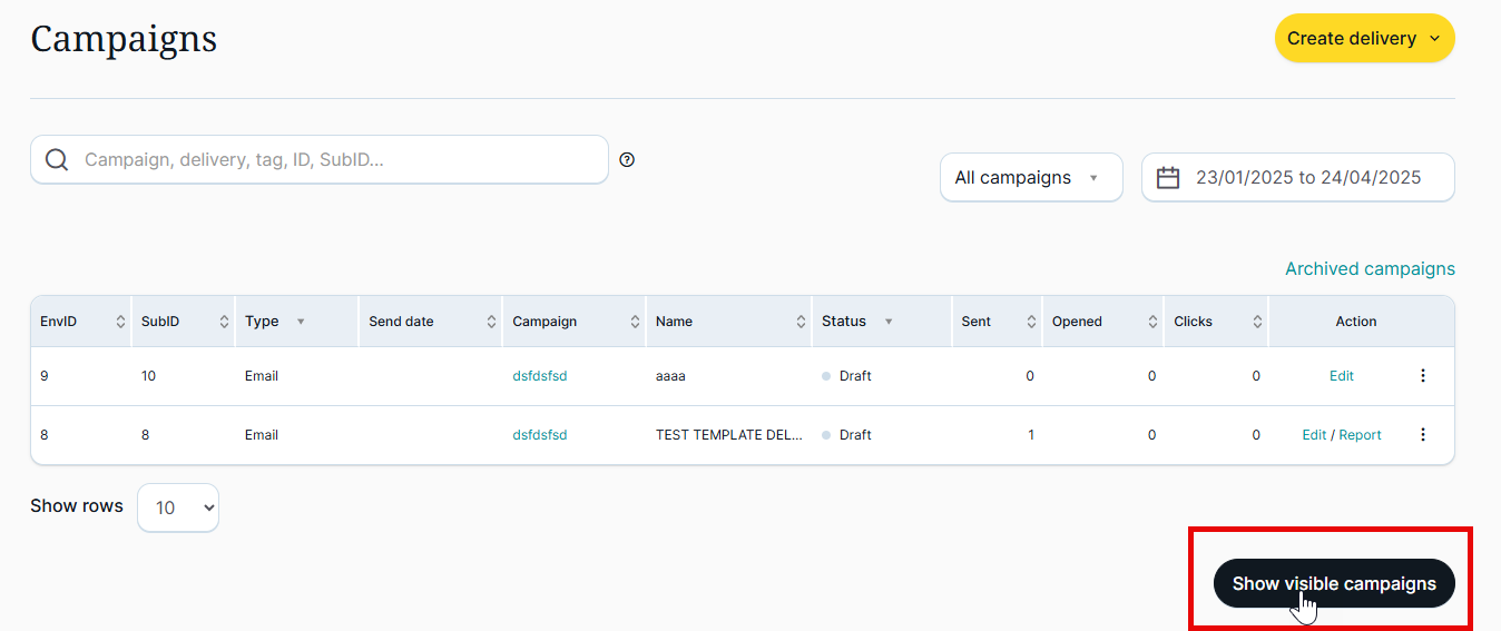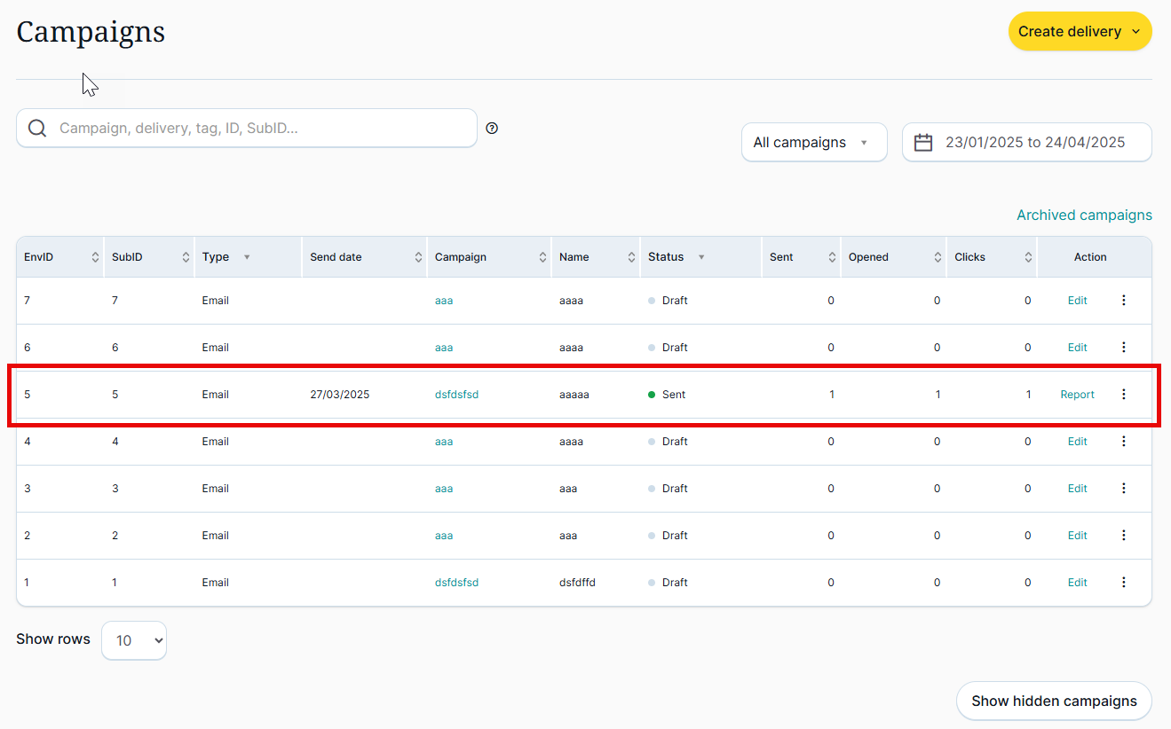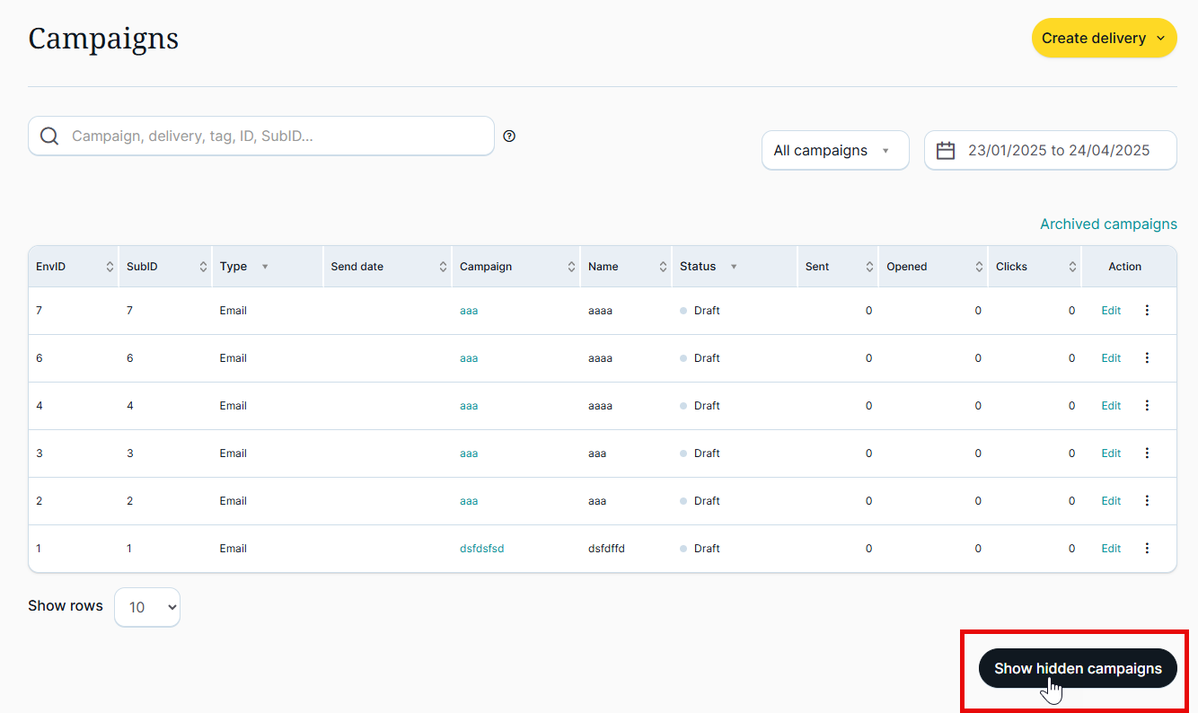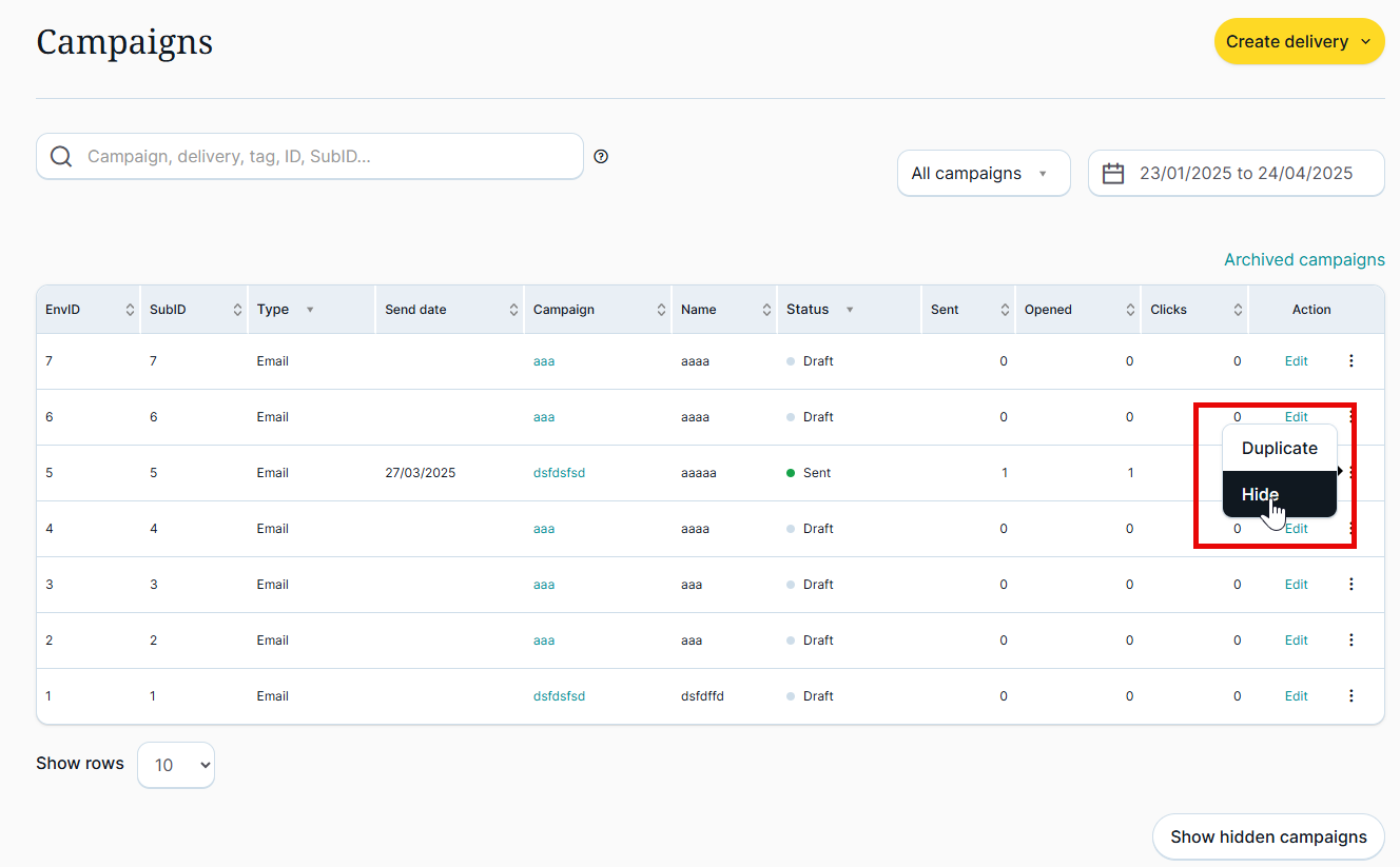 If later you want to make a delivery visible again, click the Show hidden campaigns button. This will allow you to see all the deliveries you previously hid. To make a delivery appear again in the main table, go to the actions menu and select the Show option.