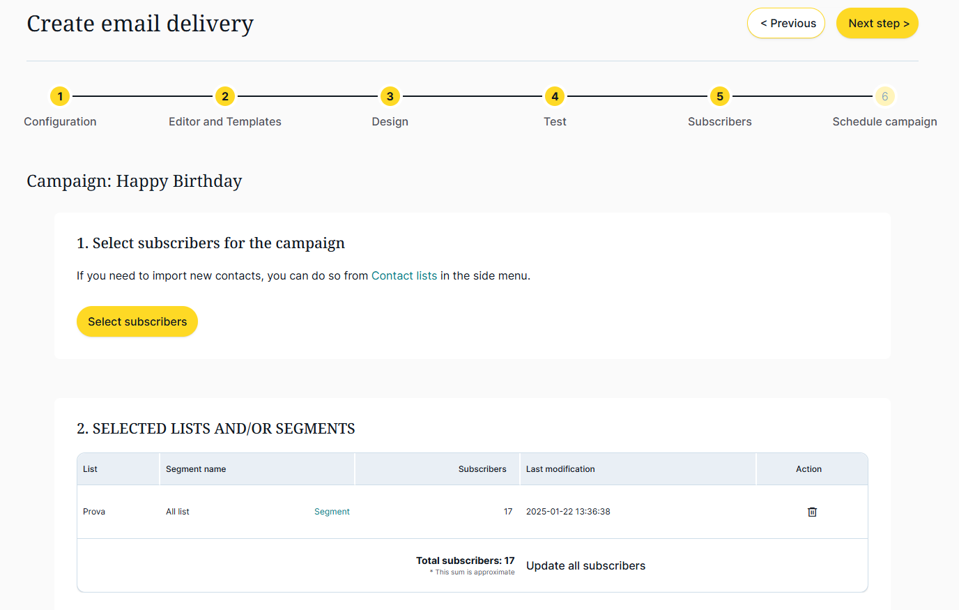 * If the mailing that we activate as automatic does not have segmentation in step "5. Subscribers" of the mailing, it will be sent to any subscriber that we receive in any list of our subaccount.