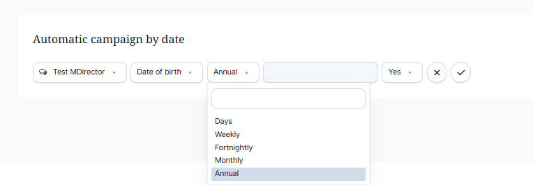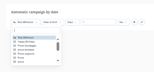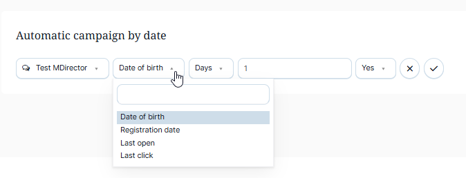 B.- In the second drop-down menu you can choose the date that will be used as a reference for the sending. There are the following default options: date of birth, registration date, last open and last click.