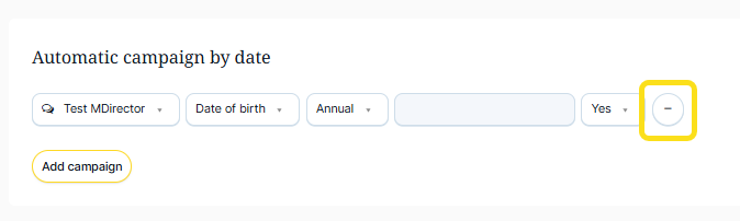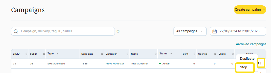 This can be done from the “Auto Delivery” tab in the Settings section, with the minus sign button, or from the Campaigns section by clicking on the three vertical dots > Stop.