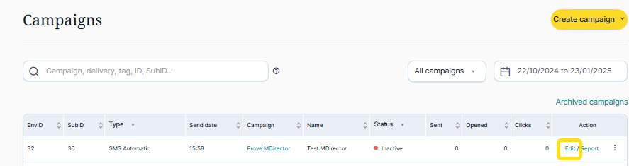 Once the auto delivery is stopped the “edit” campaign option will be enabled and we could then change the subject, template, etc.