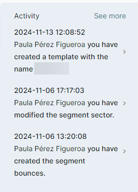 - Activity. Review the 3 last actions performed within the account. This information is stored in a log which can be viewed in full by clicking “See more”