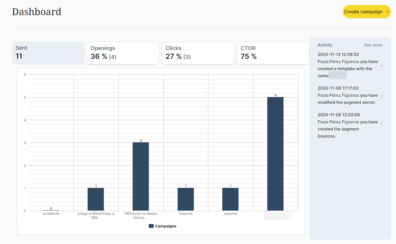 A Dashboard containing information about the latest campaigns shown in a bar chart format for easy interpretation, as well as data related to total number of campaigns sent and the percentage of opens, clicks and CTOR.
