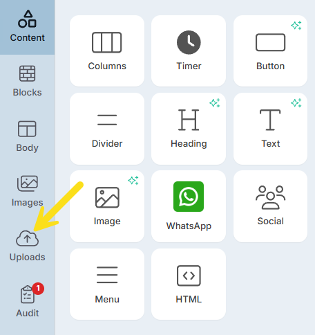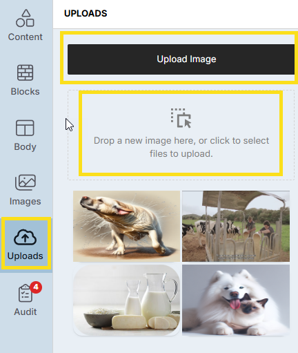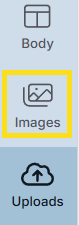 - Go to the left sidebar in the editor and click the cloud icon labeled Uploads.