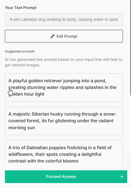 - Choose from suggested prompts or click Proceed Anyway to use your own.