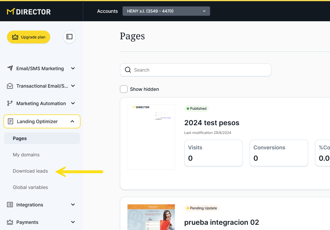 To download all leads generated in all landings, you can use the option "Download Leads" which you will find in the upper menu, clicking on your own username.