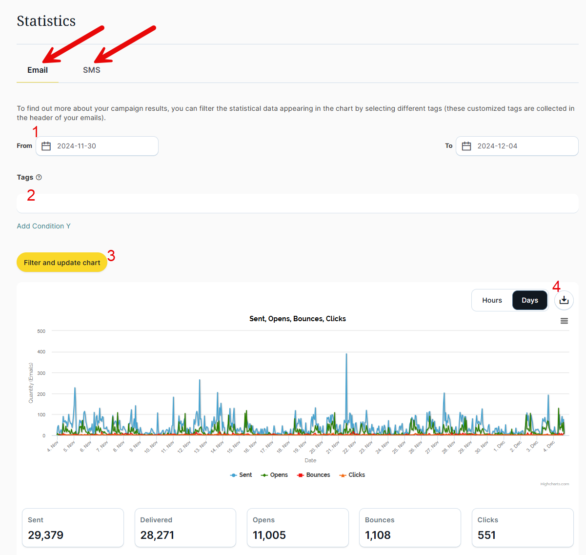- Download "raw data", i.e. contacts that have received, opened or bounced.