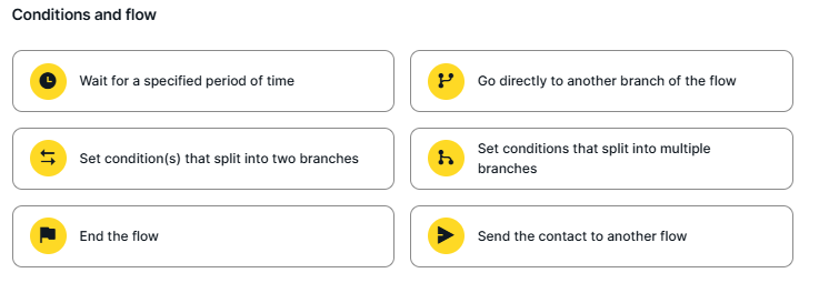 Conditions and flow control elements define the path a contact will follow through the flow, based on their actions or interactions with your messages. You can build branching structures that adjust automatically depending on the criteria met.