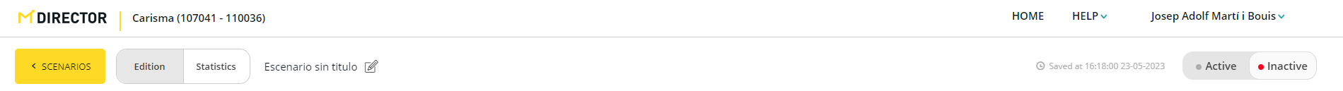 The upper area contains the following elements: a link back to the Scenarios page with the literal "Scenarios", an input box for the user to set/edit the scenario name, the buttons enable and disable scenario and a global button that gives the user the possibility to save the scenario. It also includes a button to view the statistics in real time.