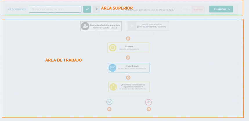 The editor workspace is one of the fundamental parts of Marketing Automation. This area will be a graphical representation of the role where you can easily build and/or edit your own scenarios.