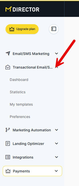 If you have a Pro or Total account, the transactional Email and SMS service will be active in your account. You can access it from the left sidebar.