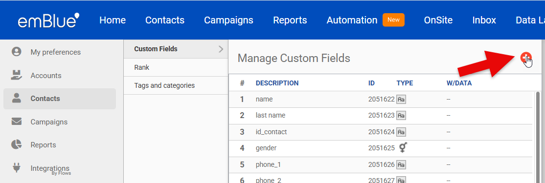 - Creating in emBlue one custom field for each field that does not exist there, keeping the same data type (text, number, date, etc.).