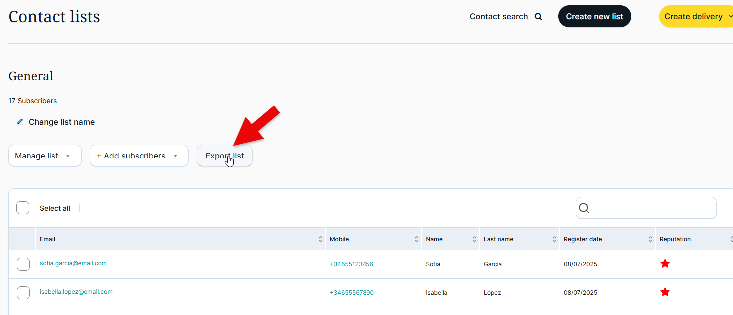 To do this, go to the 'Contact lists' section in the 'Email/SMS Marketing' module and select one of the contact lists you want to migrate to emBlue. Click the 'Export list' button.