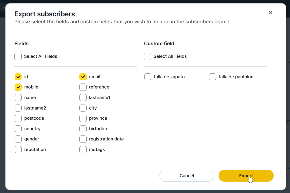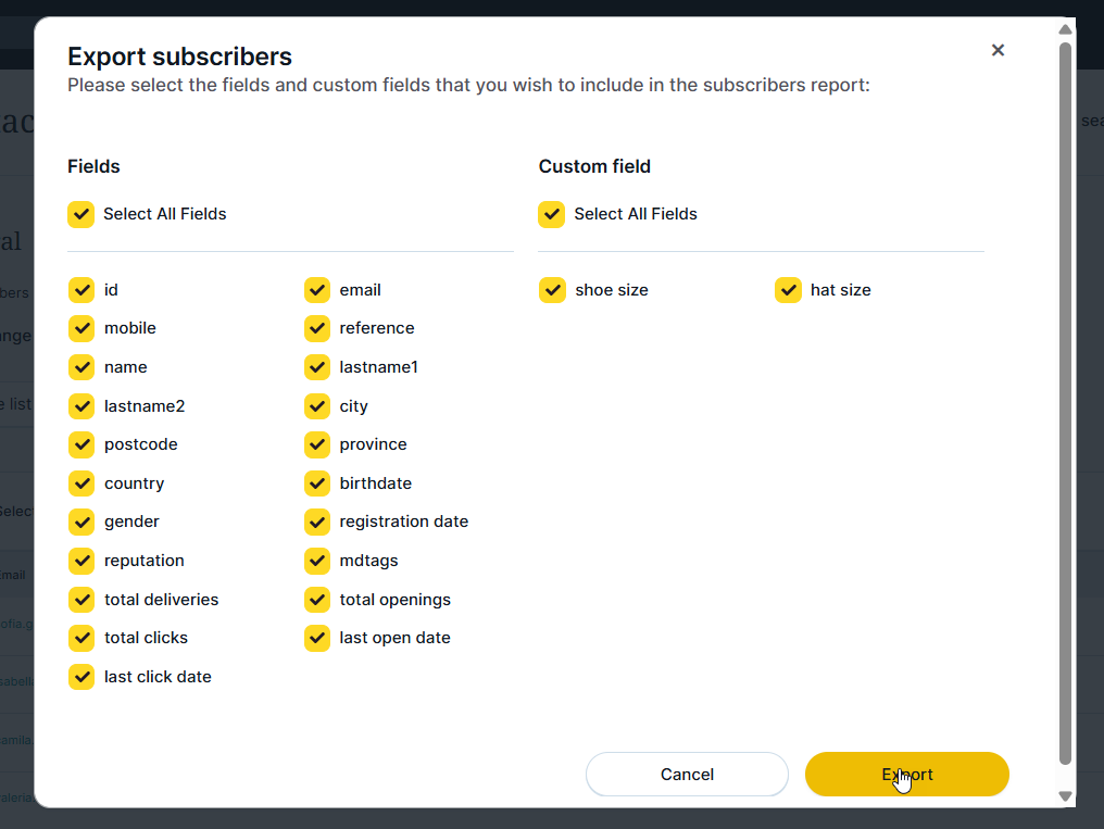 A window will open where you can select which standard and custom fields you want to export. Considering everything explained in step 3, select only the fields you need.