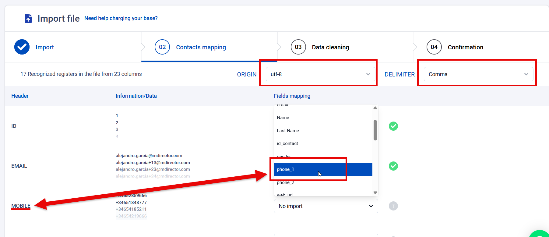 Click 'Import contacts' to move to the second step. This is where you will match the fields from the file with the standard and custom fields in your emBlue account. Make sure 'ORIGIN' is set to 'utf-8' and 'DELIMITER' to 'Comma'.