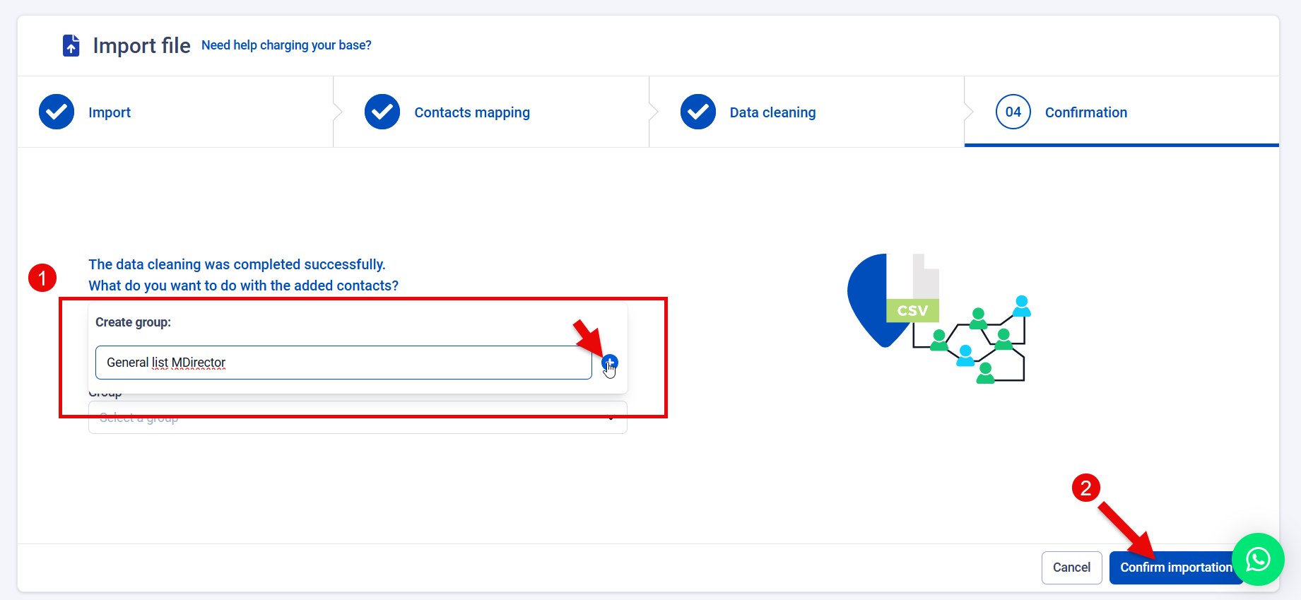 In the final step you can create a list —known in emBlue as a 'group'— in which to save the contacts. Simply select 'Assign them to a group in my list or create a new one', enter the group name, click the '+' button and confirm the import.
