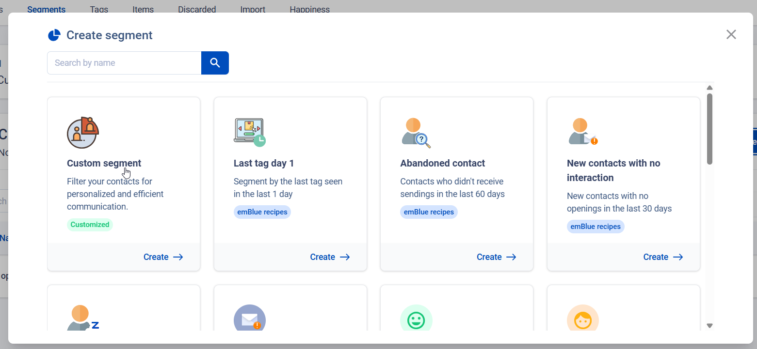 You will notice that emBlue’s segment creation module is even more complete than MDirector’s and, in addition to creating a custom segment, it also offers many predefined segments, known as emBlue recipes.