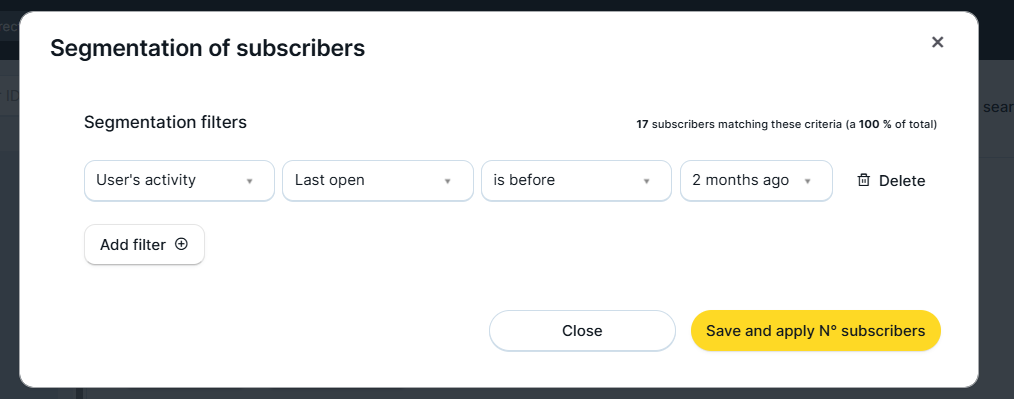 For example, let’s suppose you want to recreate this MDirector segment that filters users who opened an email in the last two months.