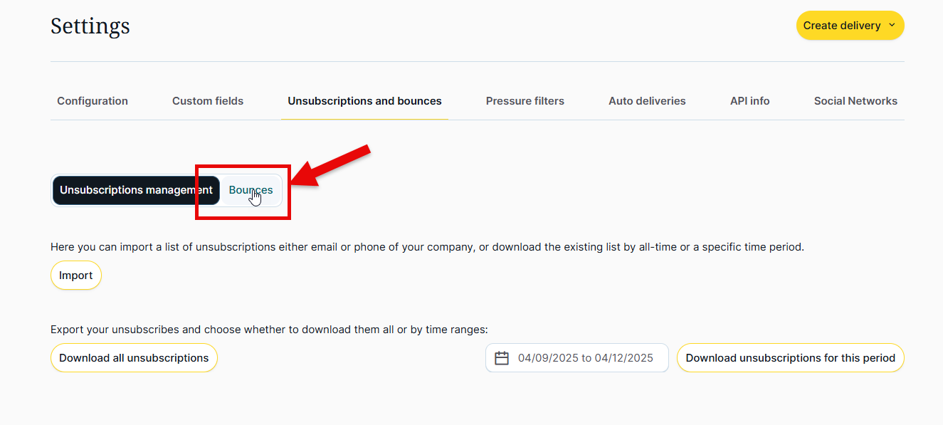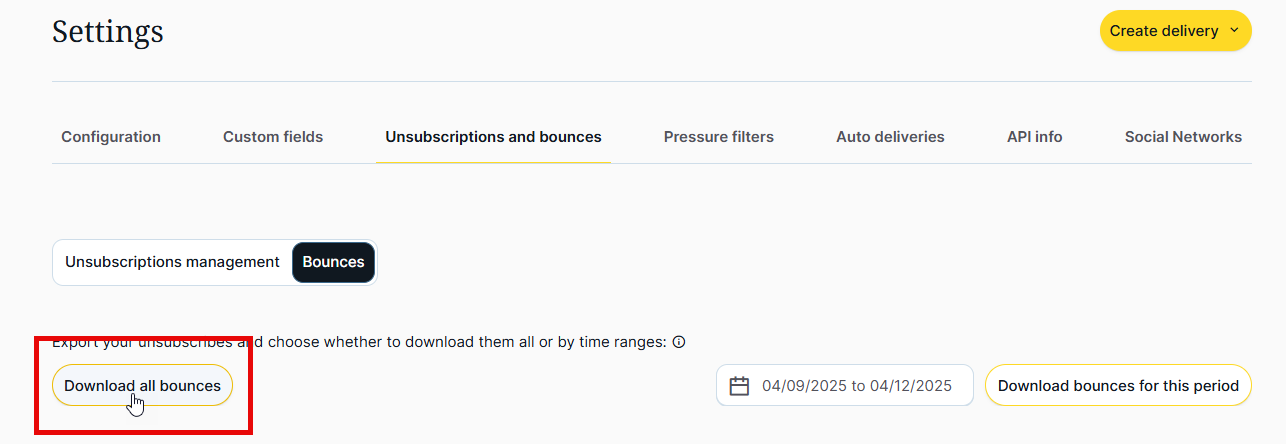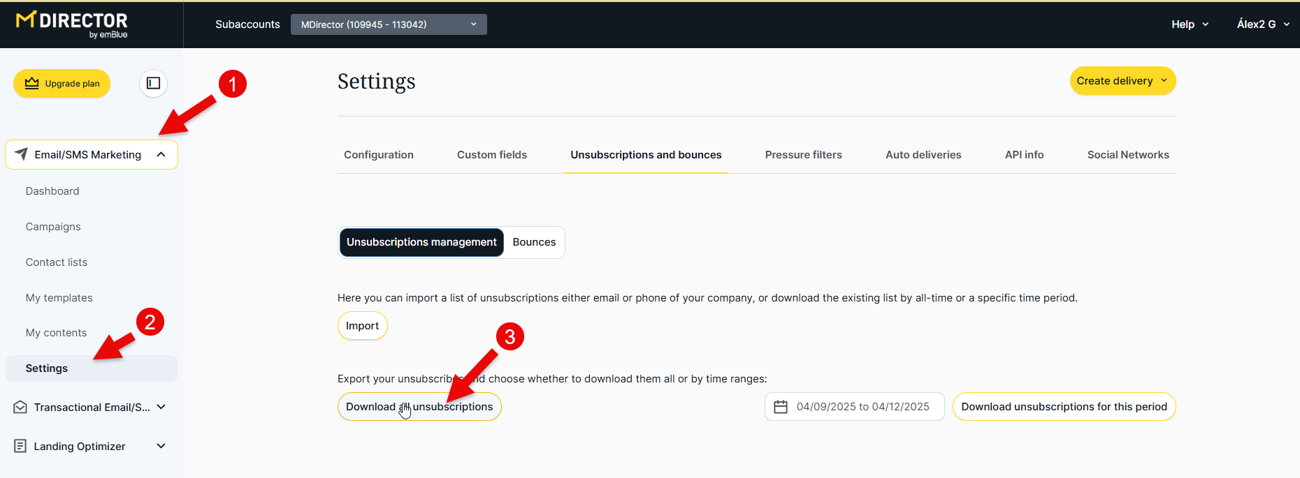 To export unsubscribes and bounces from MDirector, go to the Email Marketing module, then the 'Settings' section, and select the 'Unsubscriptions and bounces' tab. By default, you will land on unsubscribes, not bounces. To download these unsubscribes, do not select any specific date range. Just click the 'Download all unsubscriptions ' button.