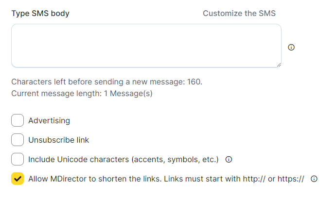 MDirector allows in the step 1 of the creation of an SMS to shorten any link so that the number of characters used is reduced to the bare minimum. To do so, you must select the checkbox "Allow MDirector to shorten the links".