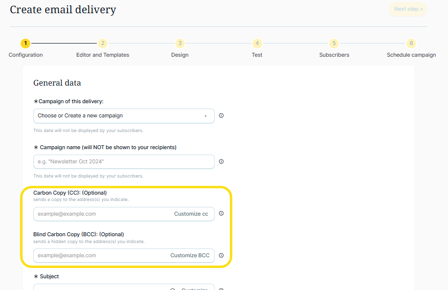 1. Add an email address (or multiple ones, separated by comas) as a copy. In this case, a copy of the email will be sent to this address (or these addresses) for each contact to which the campaign is sent.