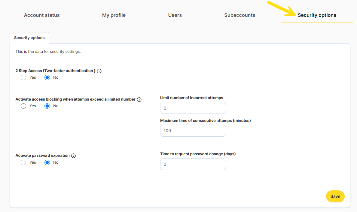 You can set a maximum number of login attempts for a specific period by entering the number of attempts in the "Incorrect login attempts limit" field and the corresponding time in the "Maximum time for consecutive attempts" field. If the number of allowed attempts is exceeded, the affected user will be deactivated and will not be able to access again until an administrator unlocks them from the "Users" menu. If there is only one user in the account or if the deactivated user is the only administrator, you will need to contact support@mdirector.com. If you want to manage your account's user roles, here is how to do it and what permissions each role has: https://mdtr.io/KHNnm