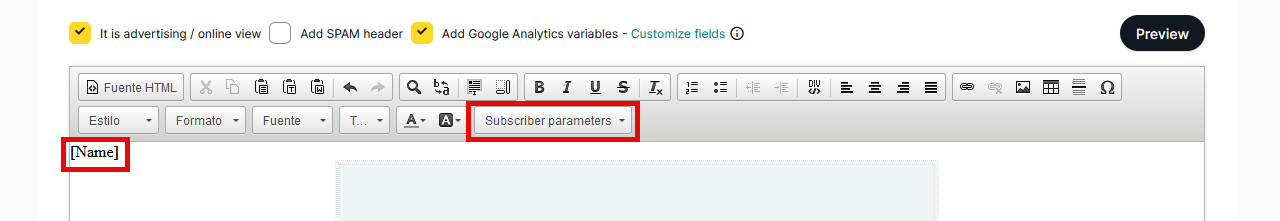 - Pressing the “Contact Fields” button when working on the newsletter content