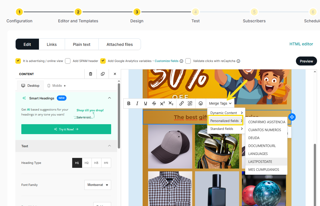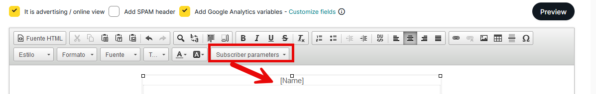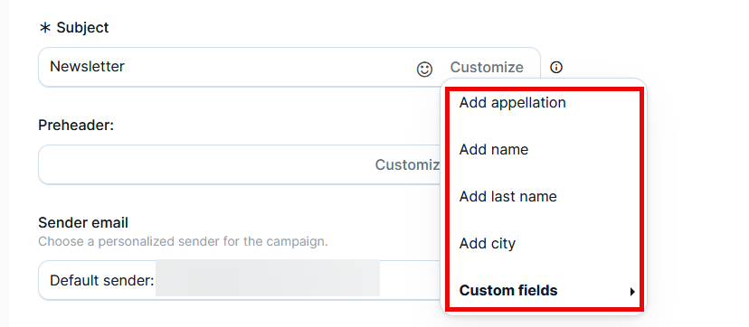 Clicking this button will display all available fields (both the predefined Standard Fields and those created in Custom Fields (https://mdtr.io/p0T0T)), while choosing one of the options will insert the selected field into the creative and each contact will receive what that field contains in its list (in our example: name).